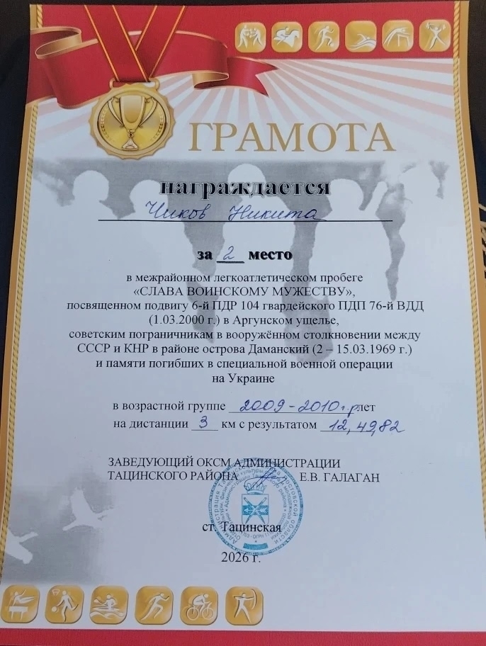 2 место — Чиков Никита (группа № 2), дистанция 3000 м.
