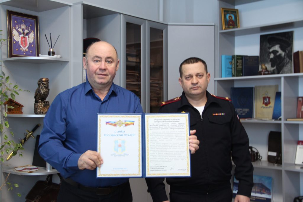 Поздравительный адрес от начальника главного Управления МО МВД России по Ростовской области передал директору-главному редактору «Морозовского вестника» Игорю Тащилину начальник полиции МО МВД «Морозовский» Николай Дуваров.