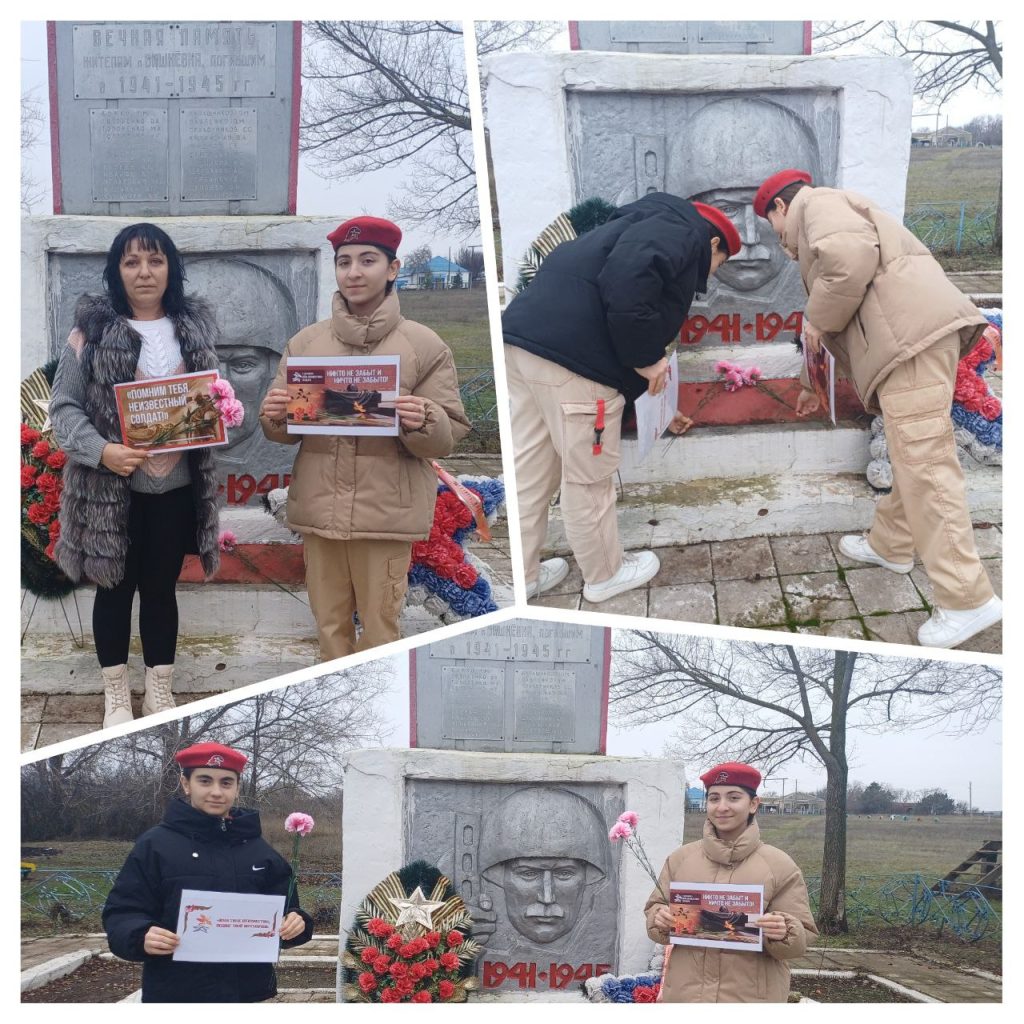 Акция «Слава героям» состоялась 7 декабря у монумента воинам, погибшим в Великой Отечественной войне. В ней приняли участие культорганизатор Вишневского СК Анна Козинкова и бойцы юнармейского отряда «Альтаир» Вишневской школы, носящего имя Героя специальной военной операции Егора Гамаюнова, — Малак Турсунова и Роза Аббасова. В ходе встречи участники узнали об истории и значении памятной даты, отмечаемой 3 декабря, а также почтили память безымянных солдат минутой молчания.