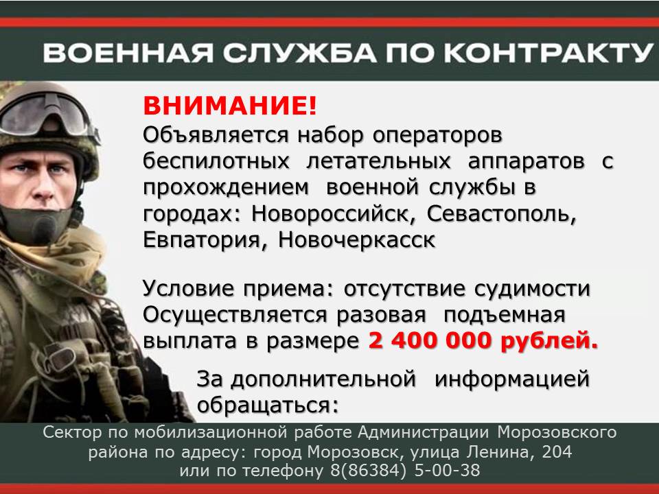 За дополнительной информацией обращаться: Сектор по мобилизационной работе Администрации Морозовского района по адресу: улица Ленина, 204 или по телефону: 8 (86384) 5-00-38.