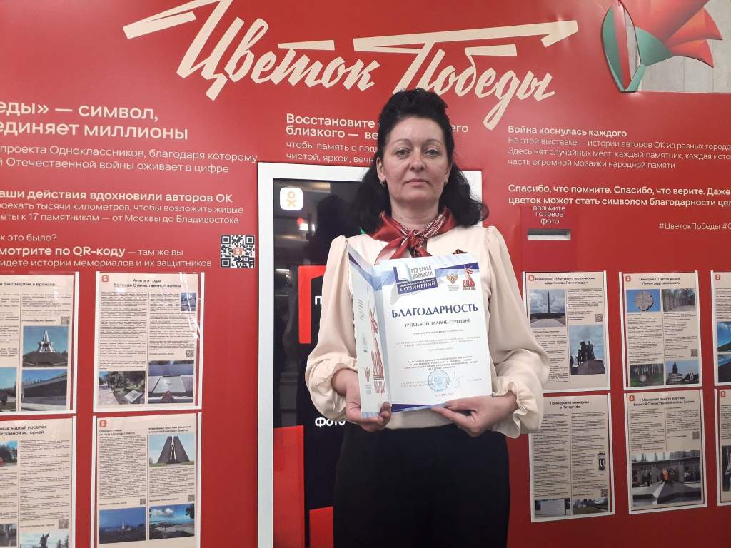 Церемония награждения победителей и призеров конкурса прошла в Музее Победы в Москве. Диплом Анастасии и благодарственное письмо вручены наставнику Анастасии — Галине Сергеевне Грошевой, заместителю директора по воспитательной работе.
